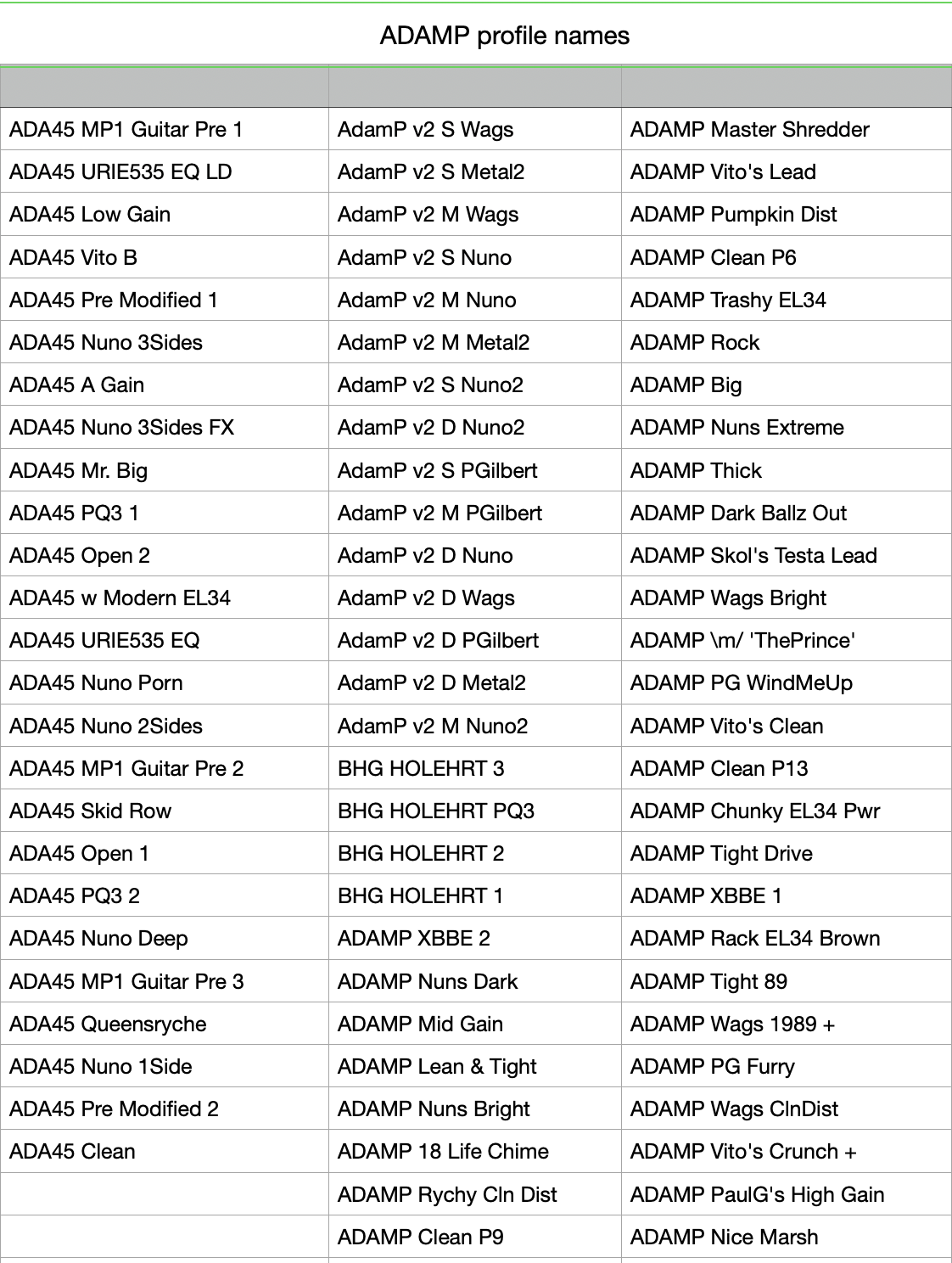 The BHP ADAMP seeks to recreate the classic guitar tones from rigs that incorporated the ADA. MP-1. The MP-1 was arguably the most widely used rack preamp among rock and metal players, do largely to it's MIDI controllability, hot rodded tones and affordable price. Players like Nuno Bettencourt (Extreme), Vito Bratta (White Lion), Paul Gilbert (Mr. Big), Skid Row and even Smashing Pumpkins and Metallica used the MP-1 extensively. The ADAMP tones were created using multiple speaker and cabinets, and actual outboard EQ unit that was actually used on many of the famous MP-1 recordings. The BHP ADAMP is a pack of 35 profiles for use with the Kemper Profiling Amplifier. NEW V2 UPDATE! : Most of my profiles are made with recording in mind (even though they work great live), and many of them emulate recorded tones. Because of that, some of the profiles match the recorded EQ curve of an album. So with the V2 patches, I was thinking, "OK, if I was going to go play a live show and brought my ( insert preamp name here ), how would I dial in my channels. The ADAMP V2 patches are 5 new STUDIO, DIRECT, and MERGED profile, ranging from clean to full searing lead. It's the first time I've ever released Direct profiles. All of the V2 profiles were recorded with a gorgeous chrome faced VHT Classic EL34 power amp, which I didn't have when working on the V1 (so that's new too).