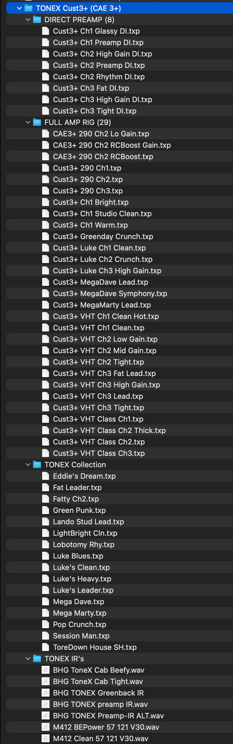 Included in this pack is 53 presets based on a Custom Audio Electronics CAE3+SE Preamp (with VHT and Mesa Power amps). 29 presets are captured with 4x12 cab, while 8 are captured direct with no cabinet, so you can add the cab IR of your choice. (actually you can choose the cab of your choice for ANY of the 37 presets). 16 presets of the TONEX Collection