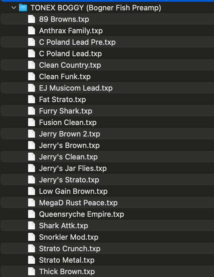 Included in this pack is 23 presets based on a Bogner Fish Preamp. This collection includes the TONEX ToneNet Collection. If you have purchased the collection from there, please send me an email and I'll upgrade you for a discounted price.