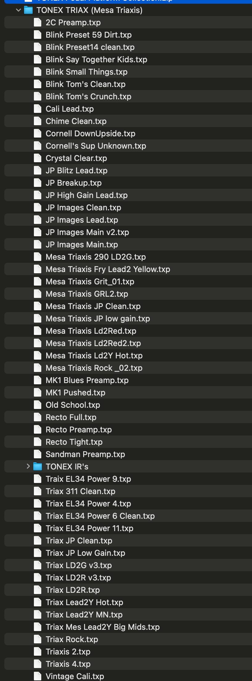 Included in this pack is 53 presets based on a Mesa Triaxis. This collection includes captures from the TONEX ToneNet Collection. If you have purchased the collection from there, please send me an email and I'll upgrade you for a discounted price.